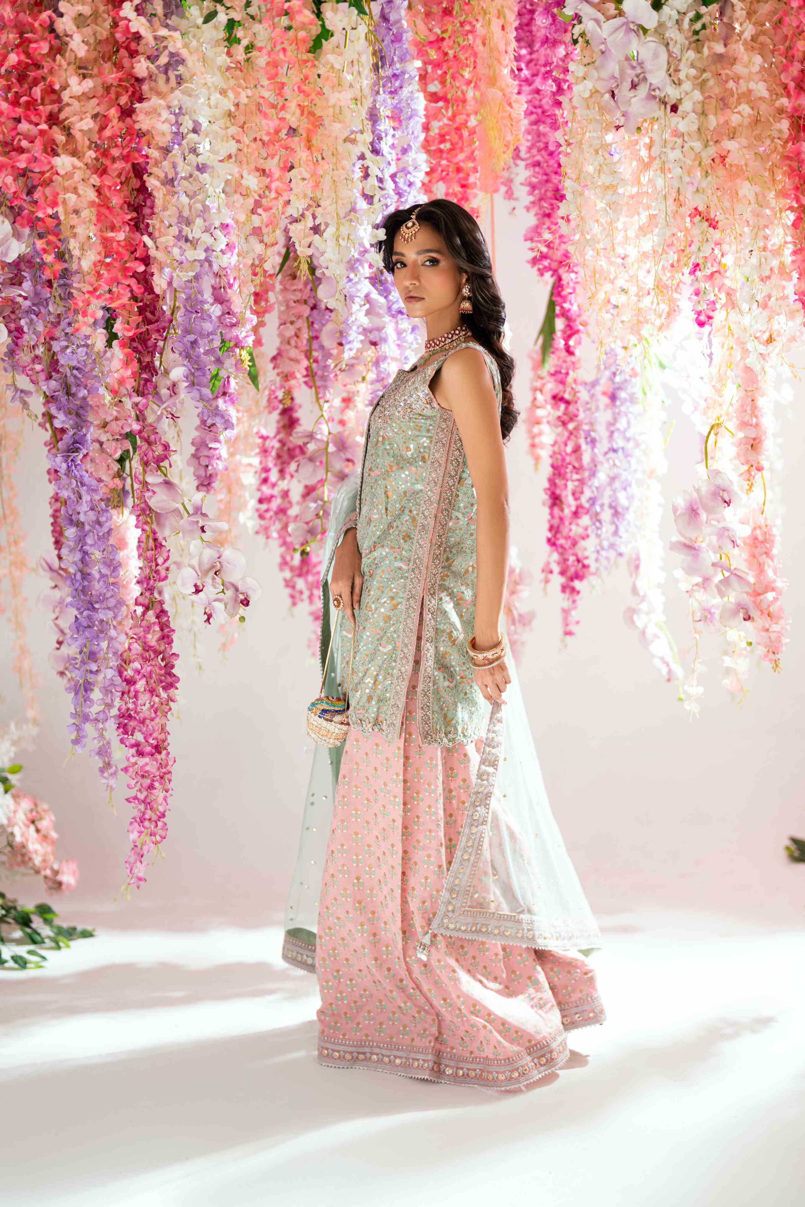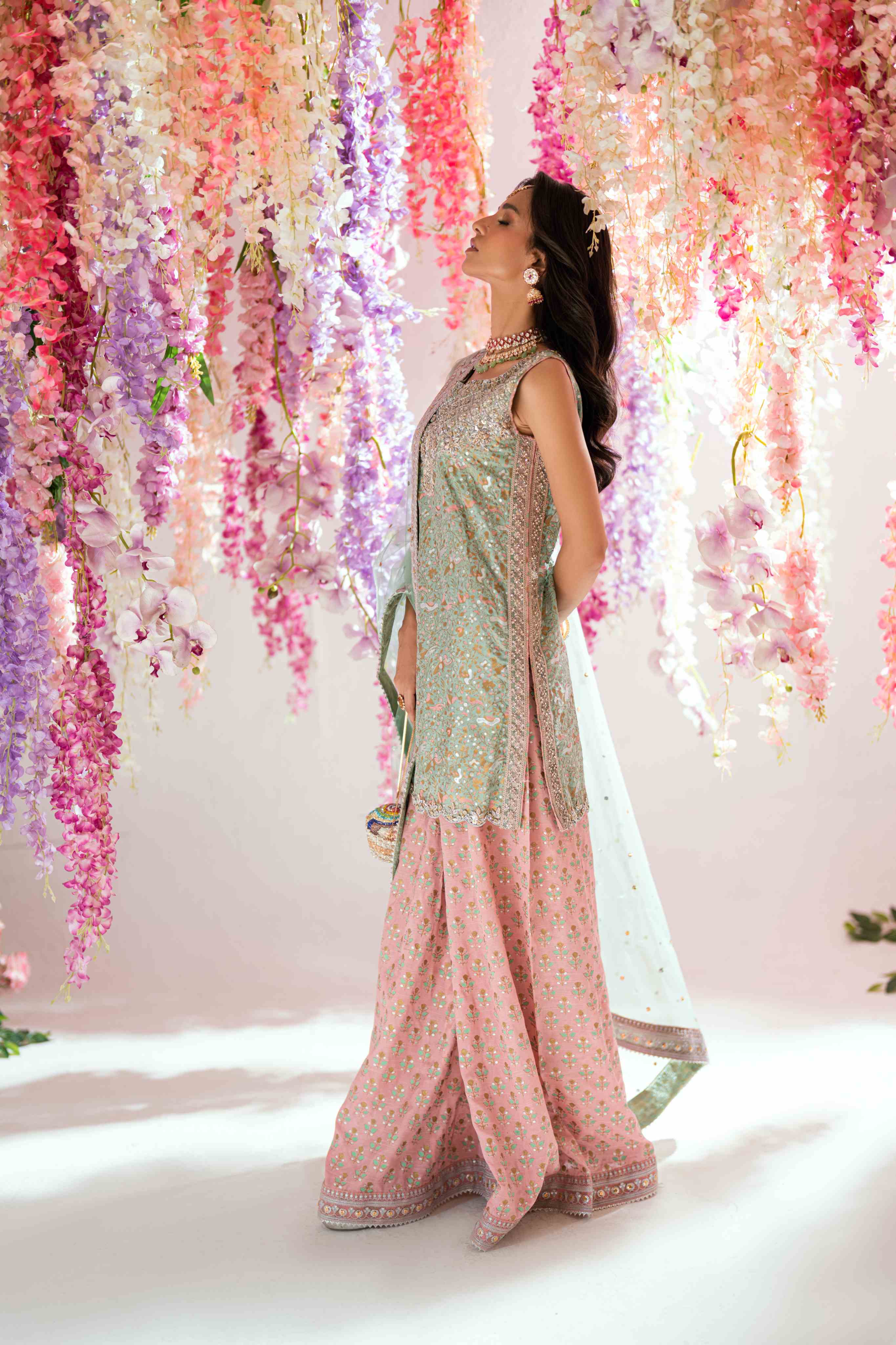 Block Printed sea green shirt with silver and gold detailing paired with tea pink dhaka pyjama & green net dupatta with silver detailing