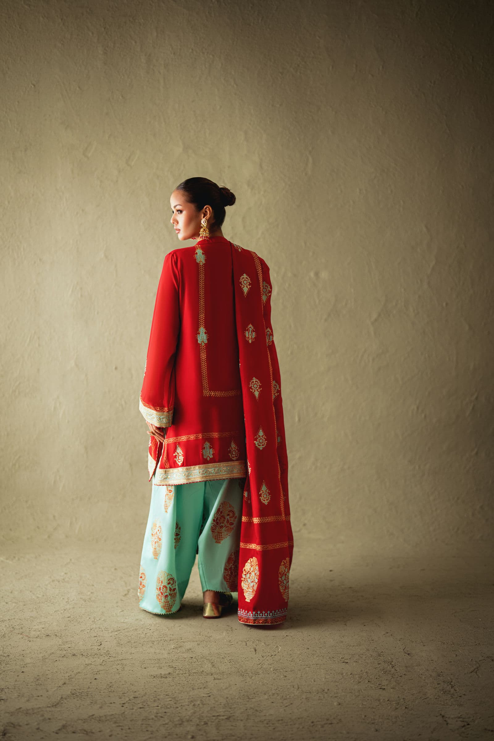 Red chiffon block printed shirt with stone detailing paired with block printed farshi shalwar & block printed dupatta