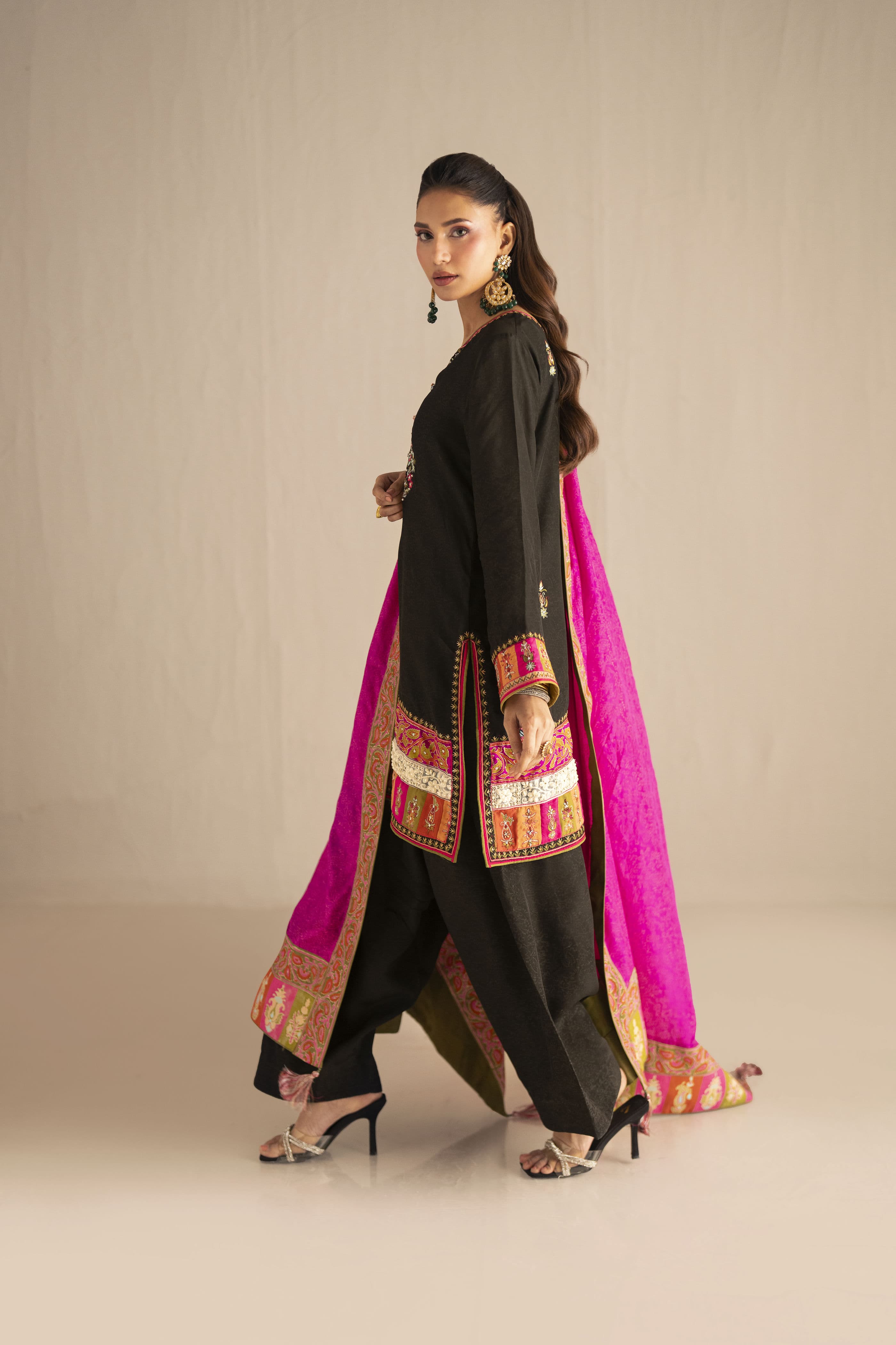 Black self block-printed shirt with multi-shaded arri work, paired with a matching shalwar and candy-pink silk dupatta.