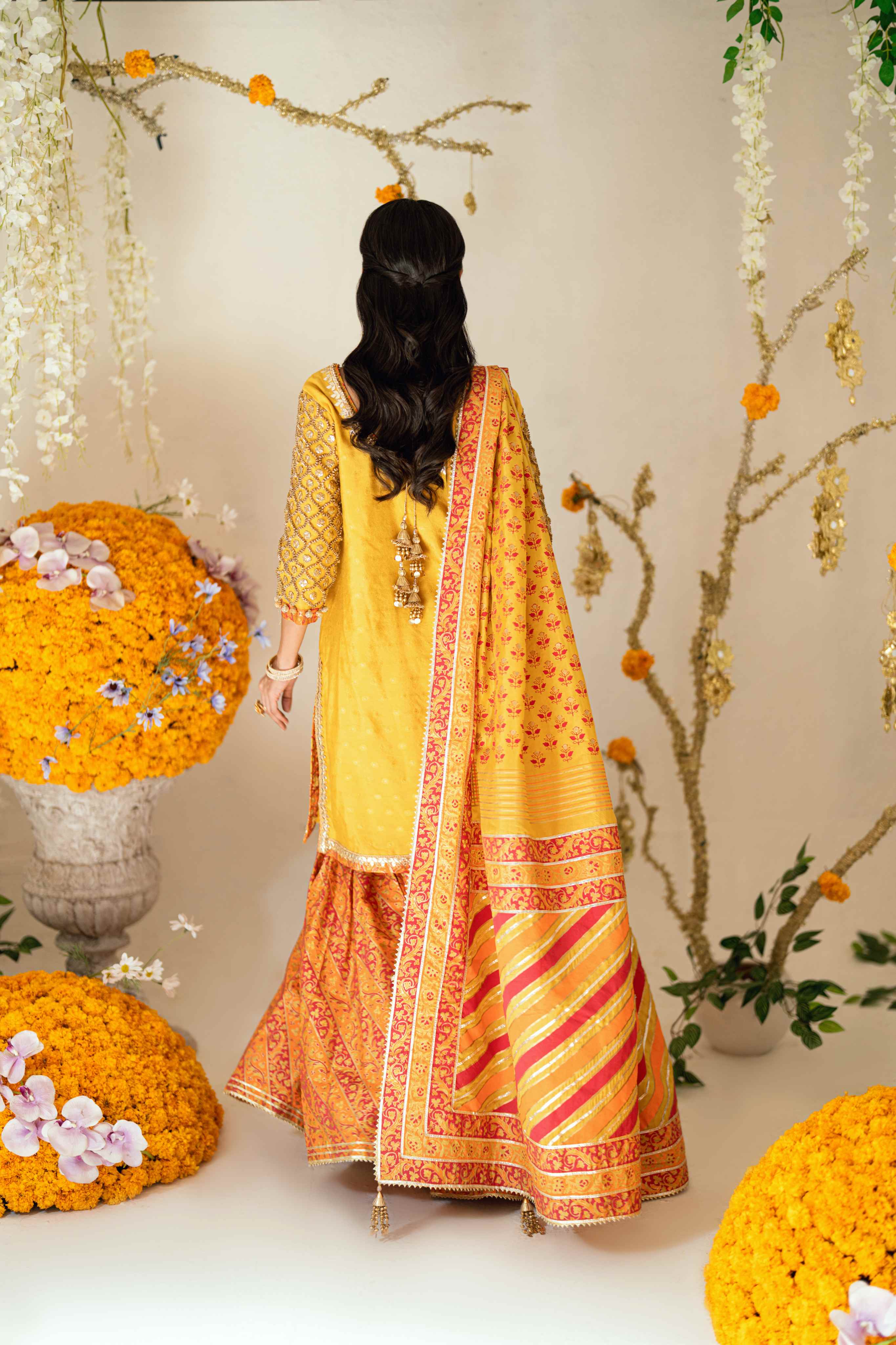 Yellow cotton net shirt with gotaa work detailing paired with block printed gharara & dupatta