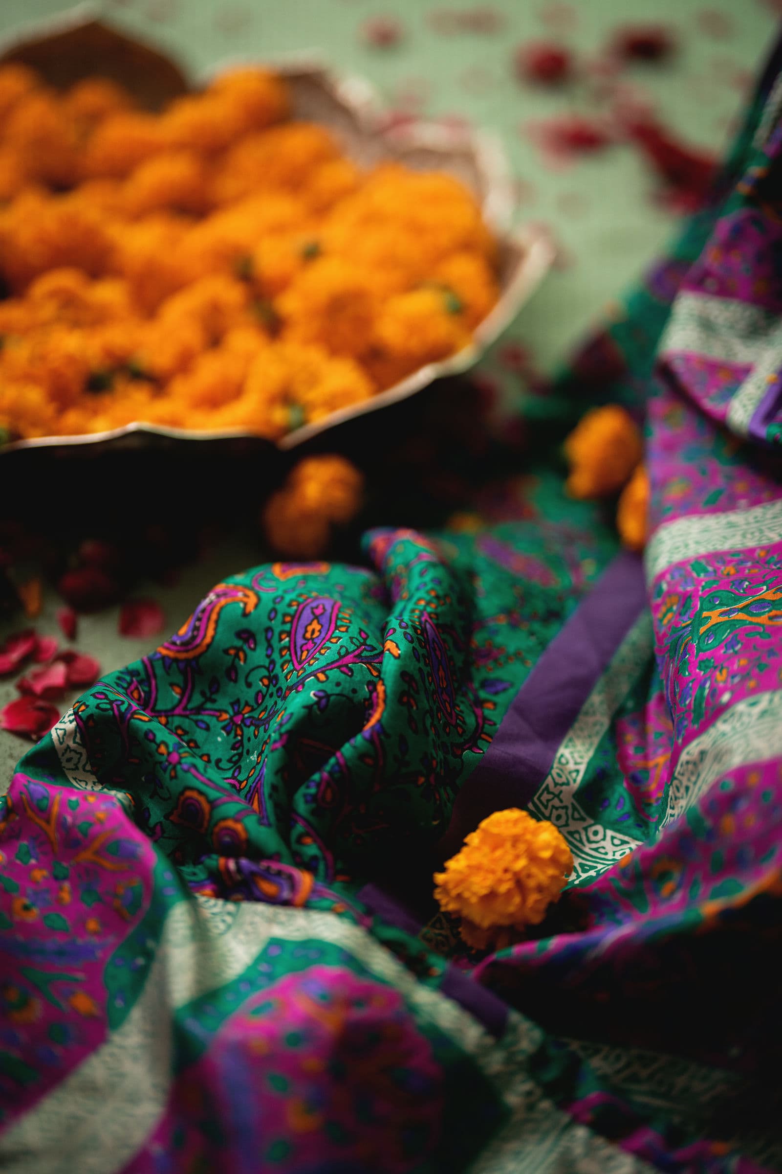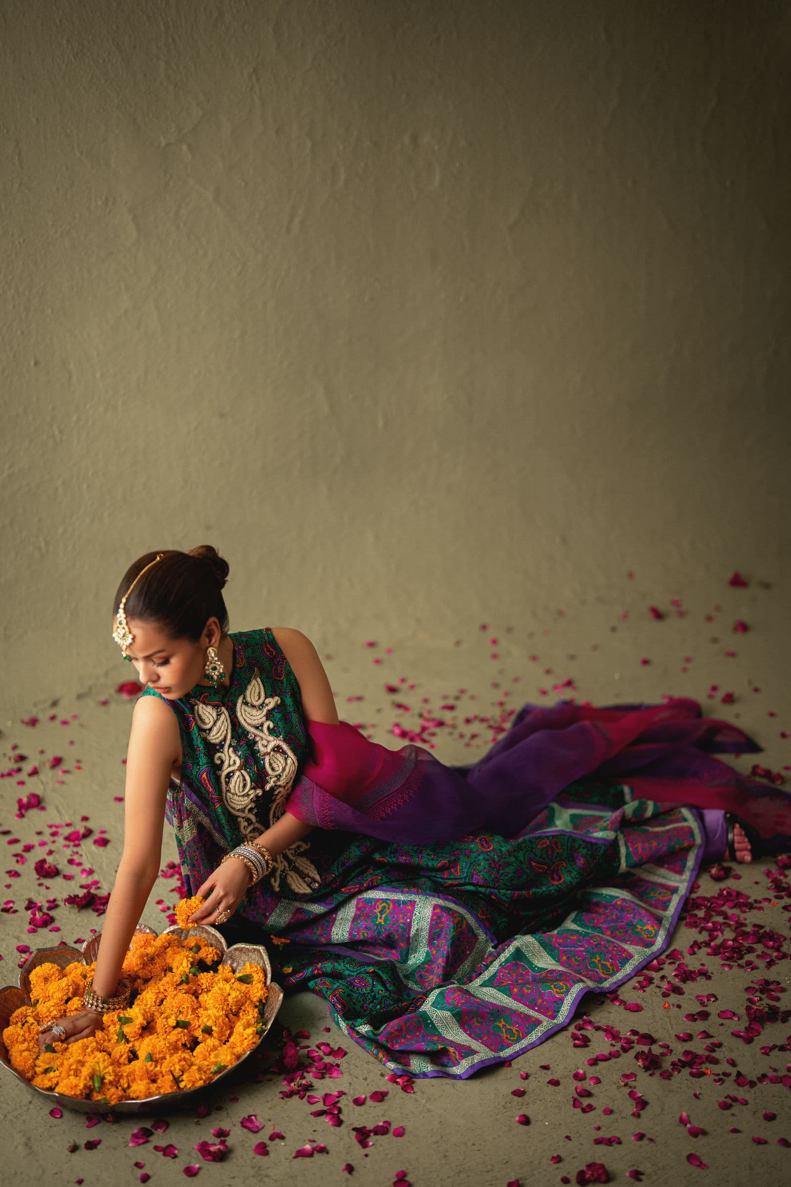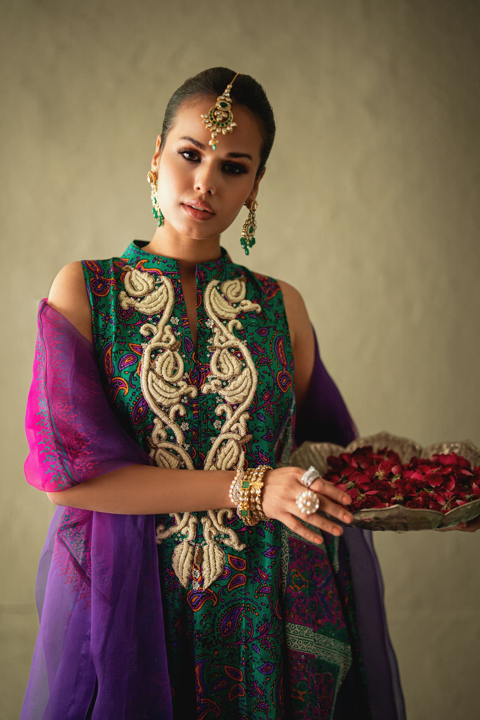 Emerald green & purple block print Stone Detaling flared kaftan with purple plazoo & Organza joined dupatta