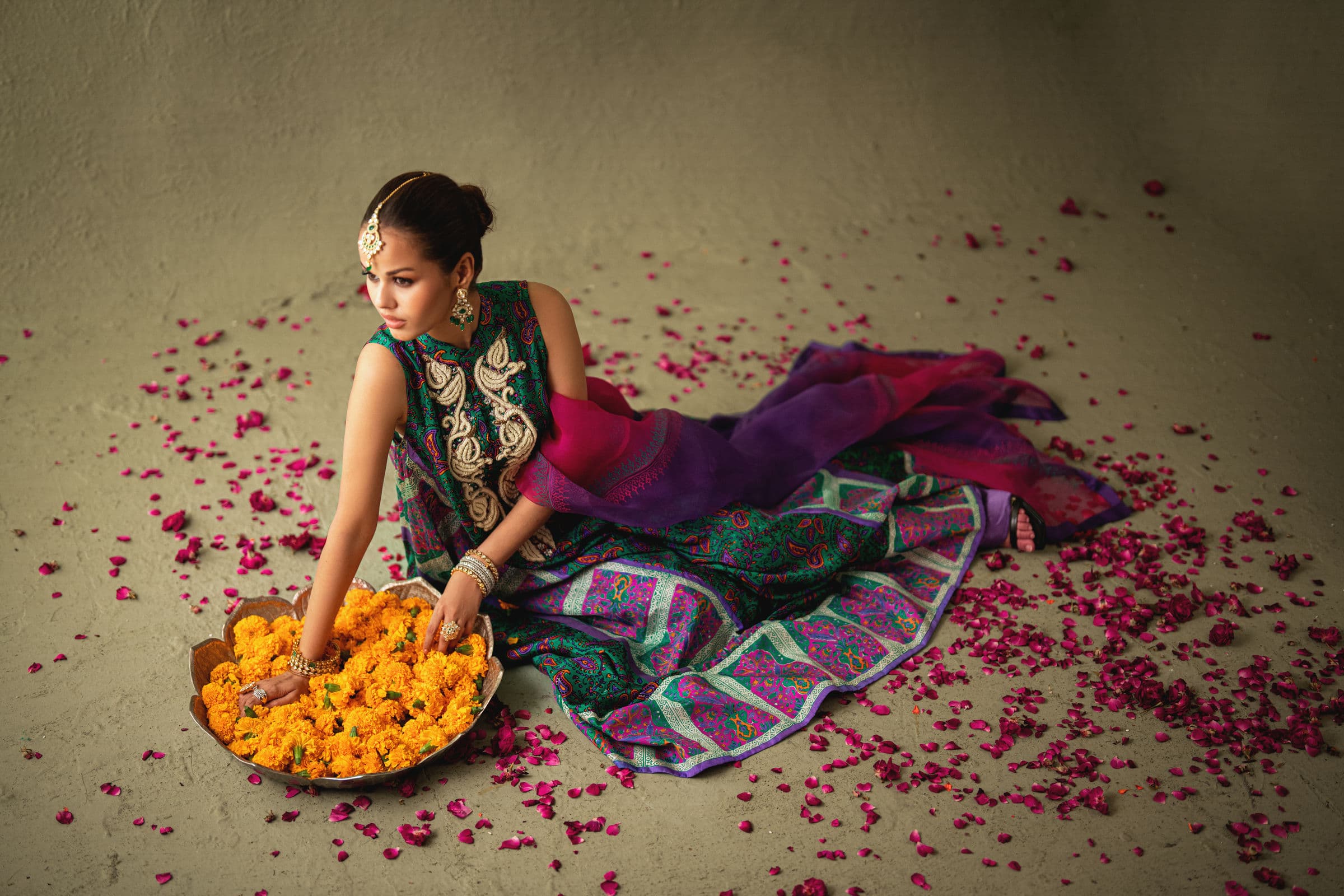 Shehrnaz - Seren Emerald-Purple Silk Kaftan - SHK-1582 - Emerald Green - Pure Medium Silk - 3 Piece