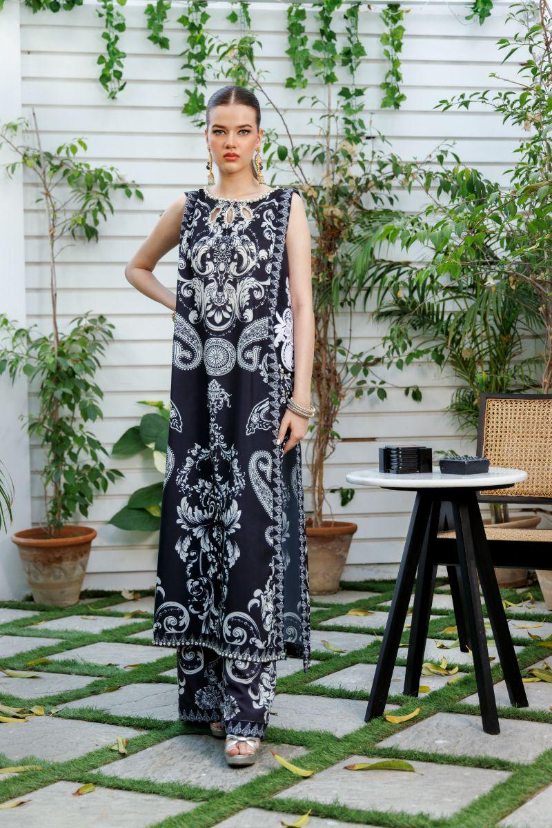 Black & white digitally printed long shirt with stone embellishment paired with matching azaar pants