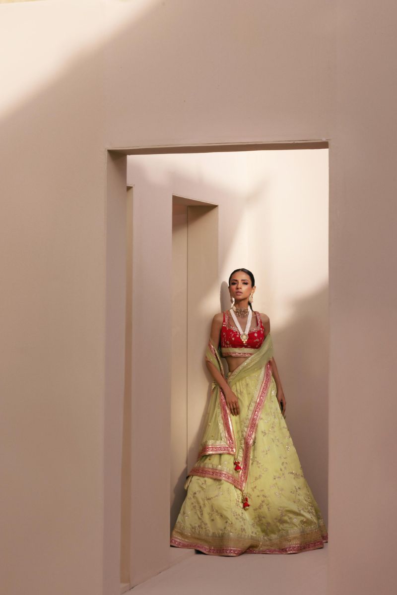 Sea green lehenga with gold embroidery paired with matching dupatta & hot pink choli-