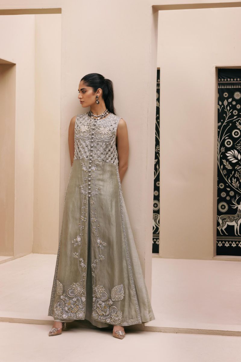 Silver grey pure silk long coat with silver & gold embellishment paired with matching azaar pants-