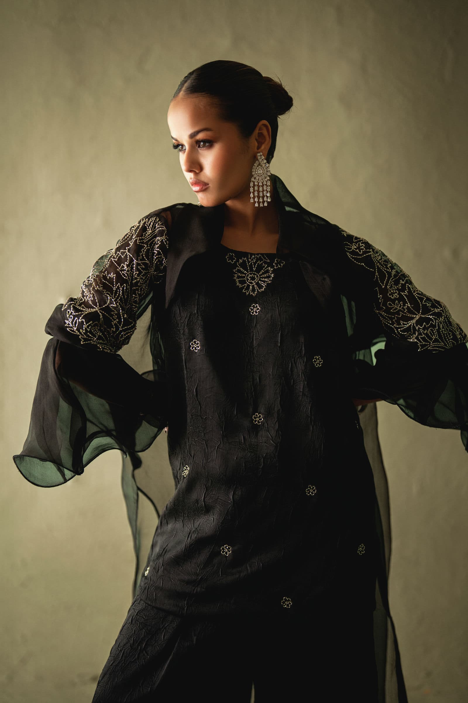 Black pure Organza pleated coat with cut Dana frill sleeves with crush slip & crush plazoo