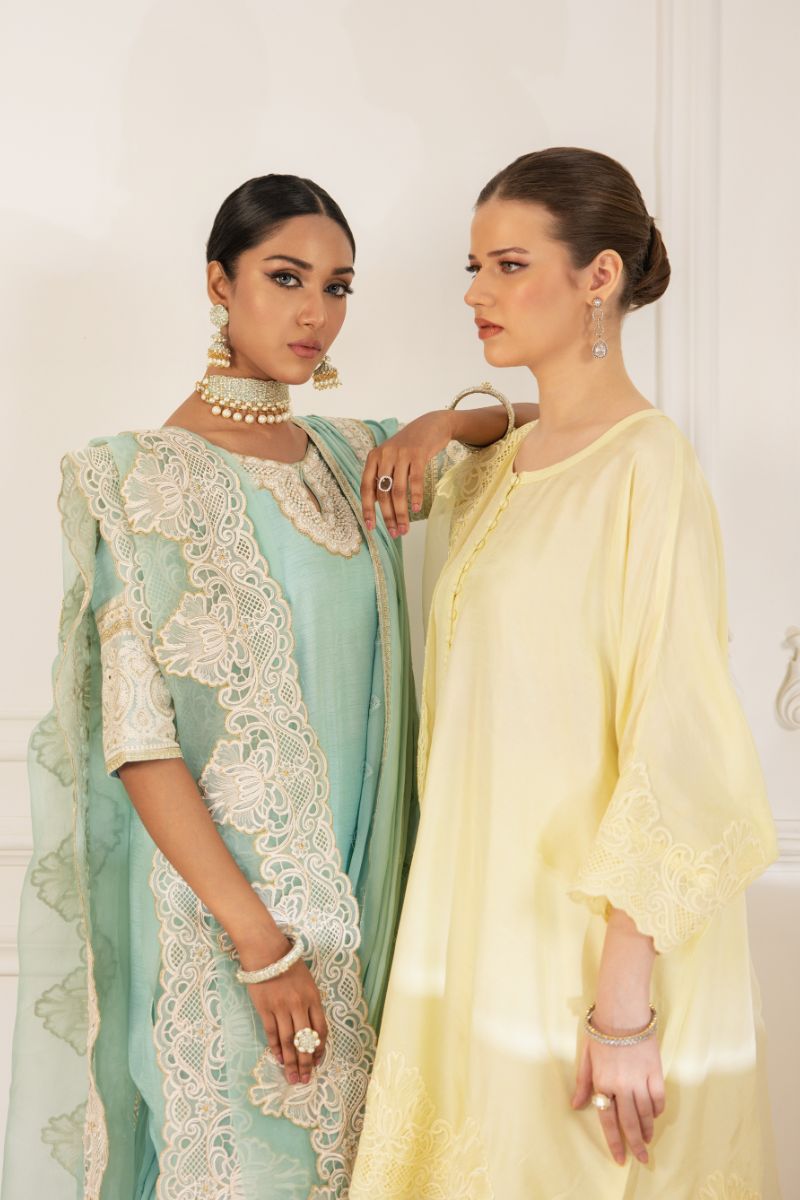 Lime green silk firdous tunic with cutwork detailing paired with matching shalwar & organza dupatta with embroidery detailing