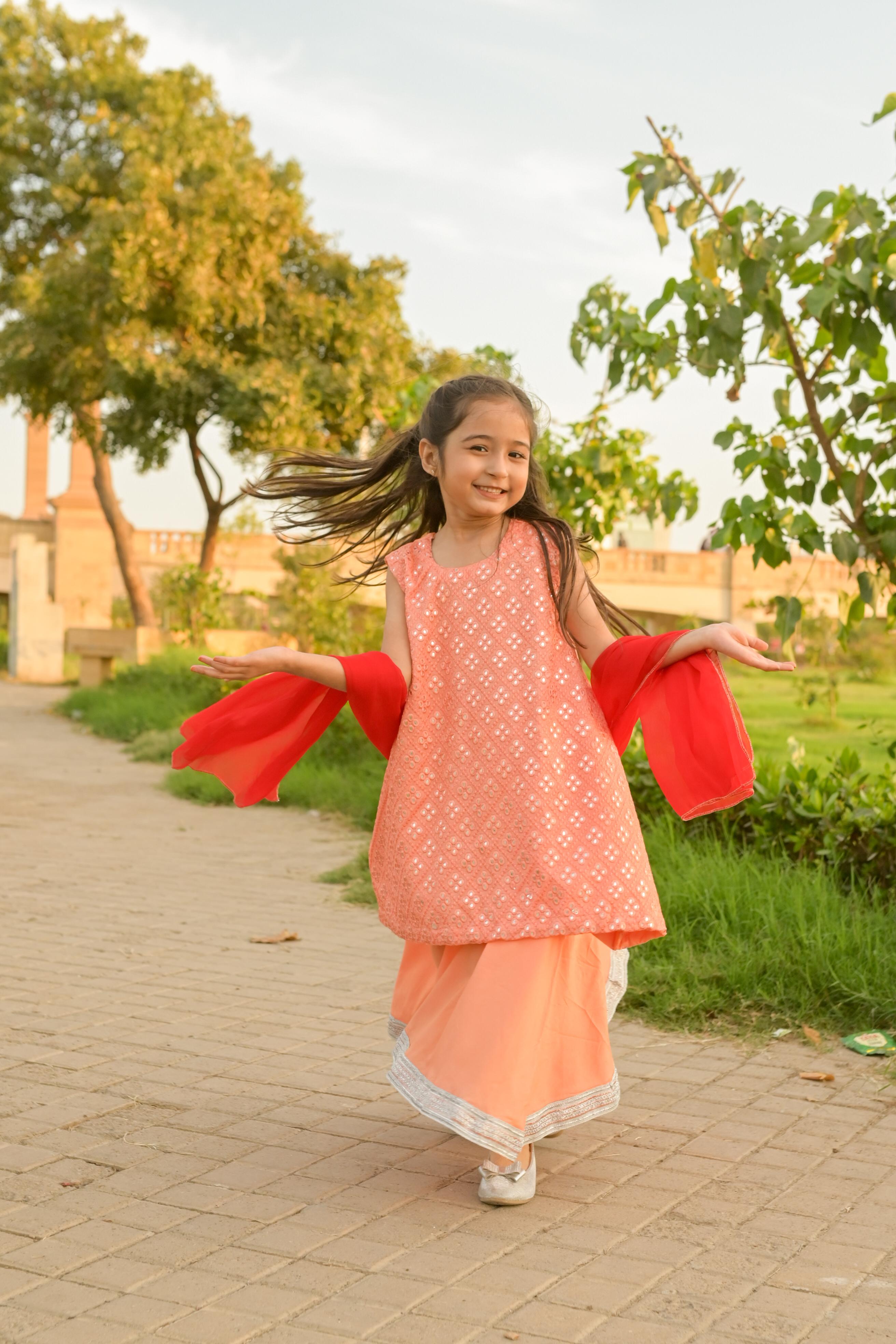 Let your little star shine in this gorgeous three-piece dress! The foil-detailed A-line top brings just the right amount of sparkle, while the flowy palazzo with lace accents adds a playful yet elegant touch. Paired with a light chiffon dupatta, this outfit is perfect for festive fun and celebrations.
