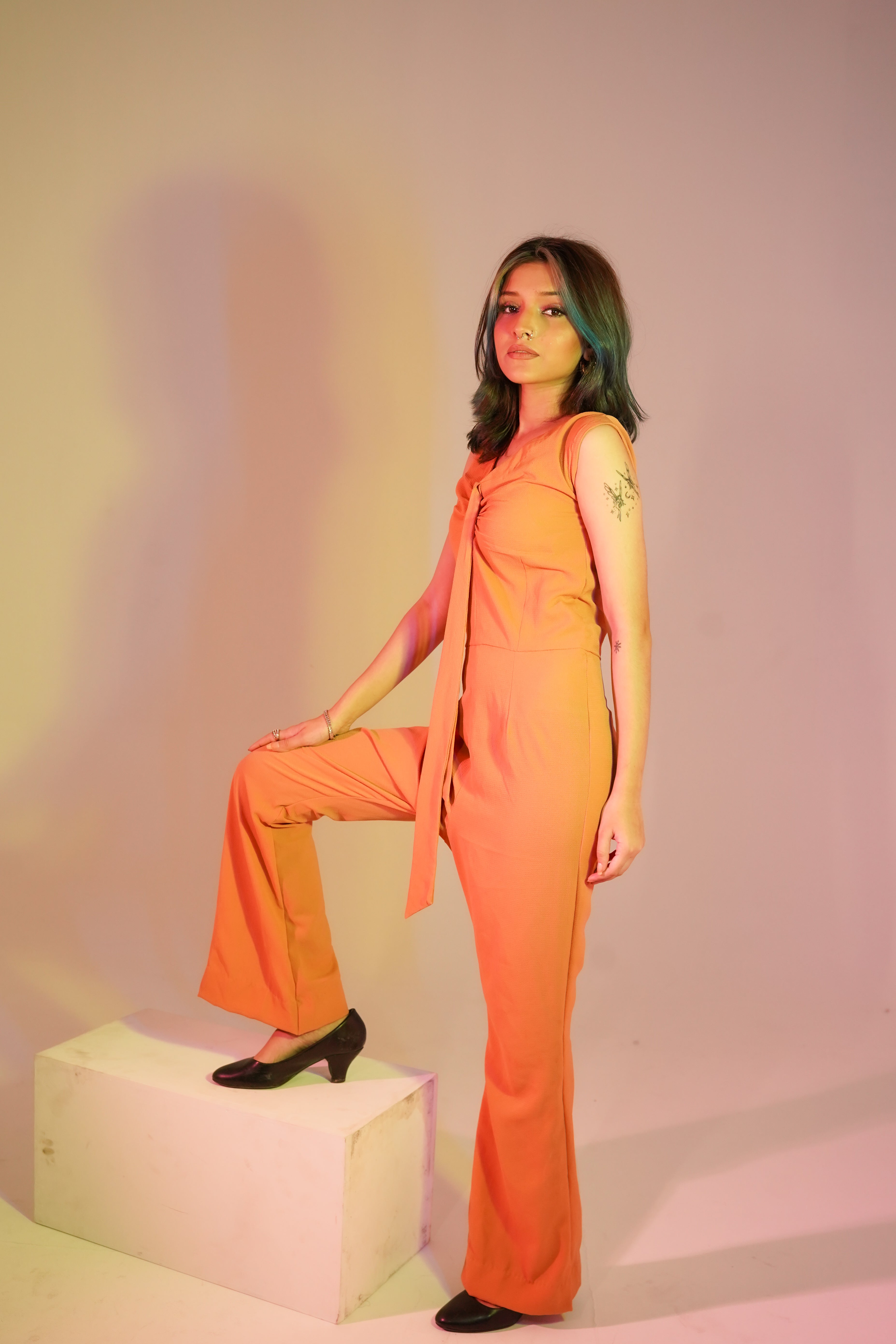 Introducing a stylish jumpsuit with a touch of charm! This jumpsuit features delicate gathers on the chest, creating a subtle texture that adds an elegant dimension. The V-neckline offers a flattering silhouette, with a chic bow tie. This jumpsuit effortlessly combines comfort and sophistication for a versatile and trendy ensemble.
