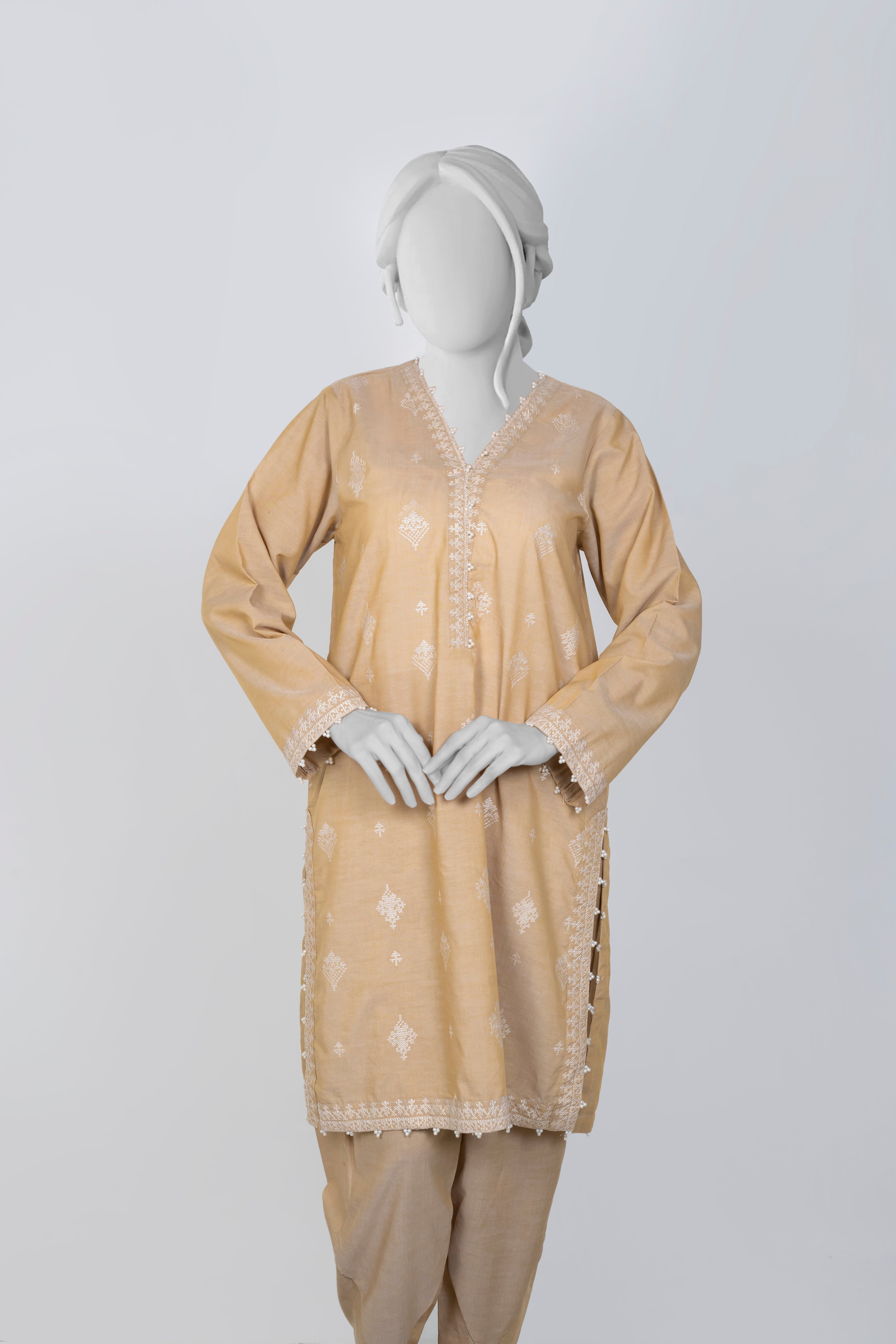 Embrace the Chambray Winters 2025 collection with this elegant Beige 2-piece set featuring solid embroidery that adds refined texture and charm. Paired with tulip-shaped trousers, it offers a fresh and graceful silhouette perfect for stylish winter wear. This ensemble blends comfort and sophistication, making it an ideal choice for those seeking understated elegance with a modern touch.