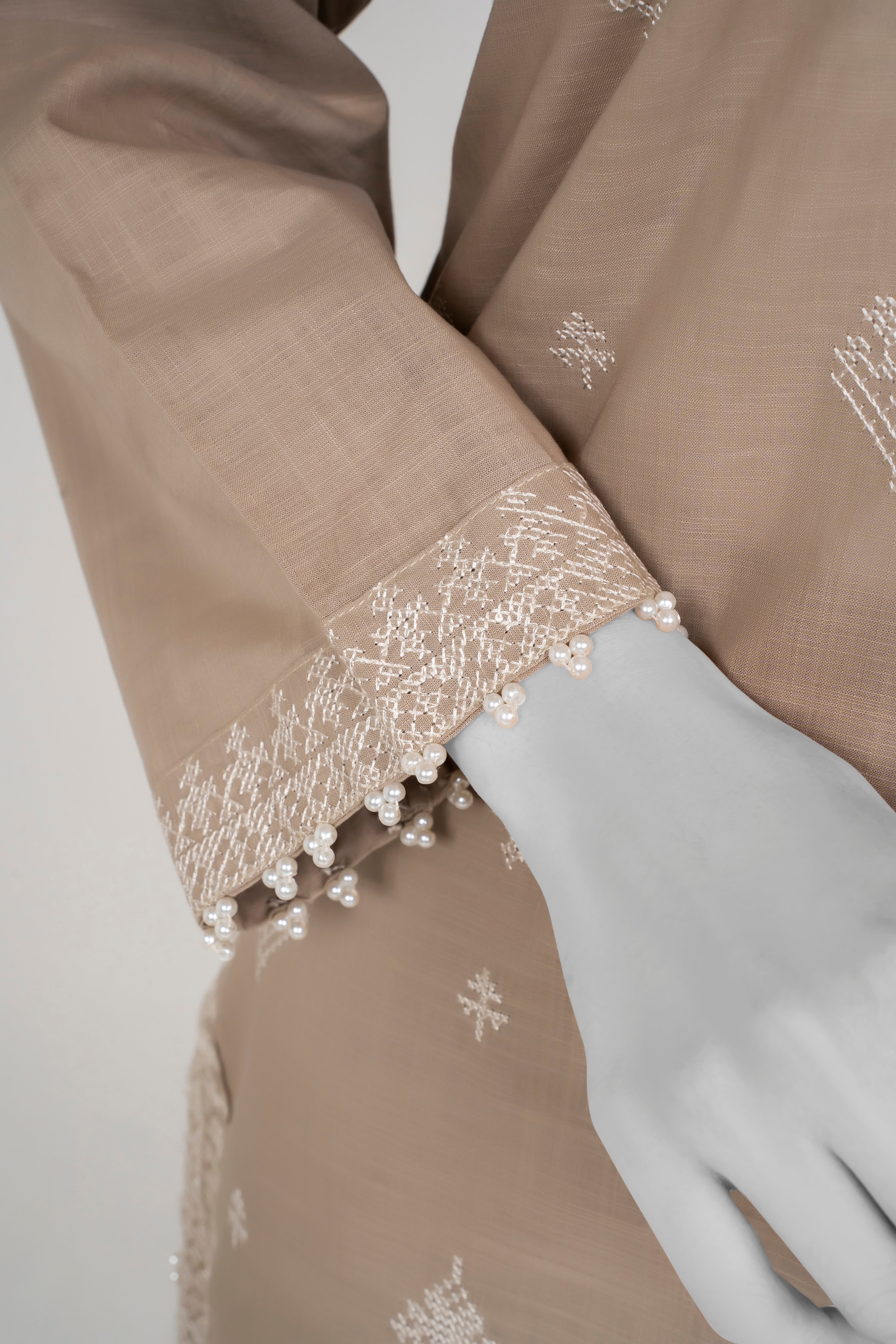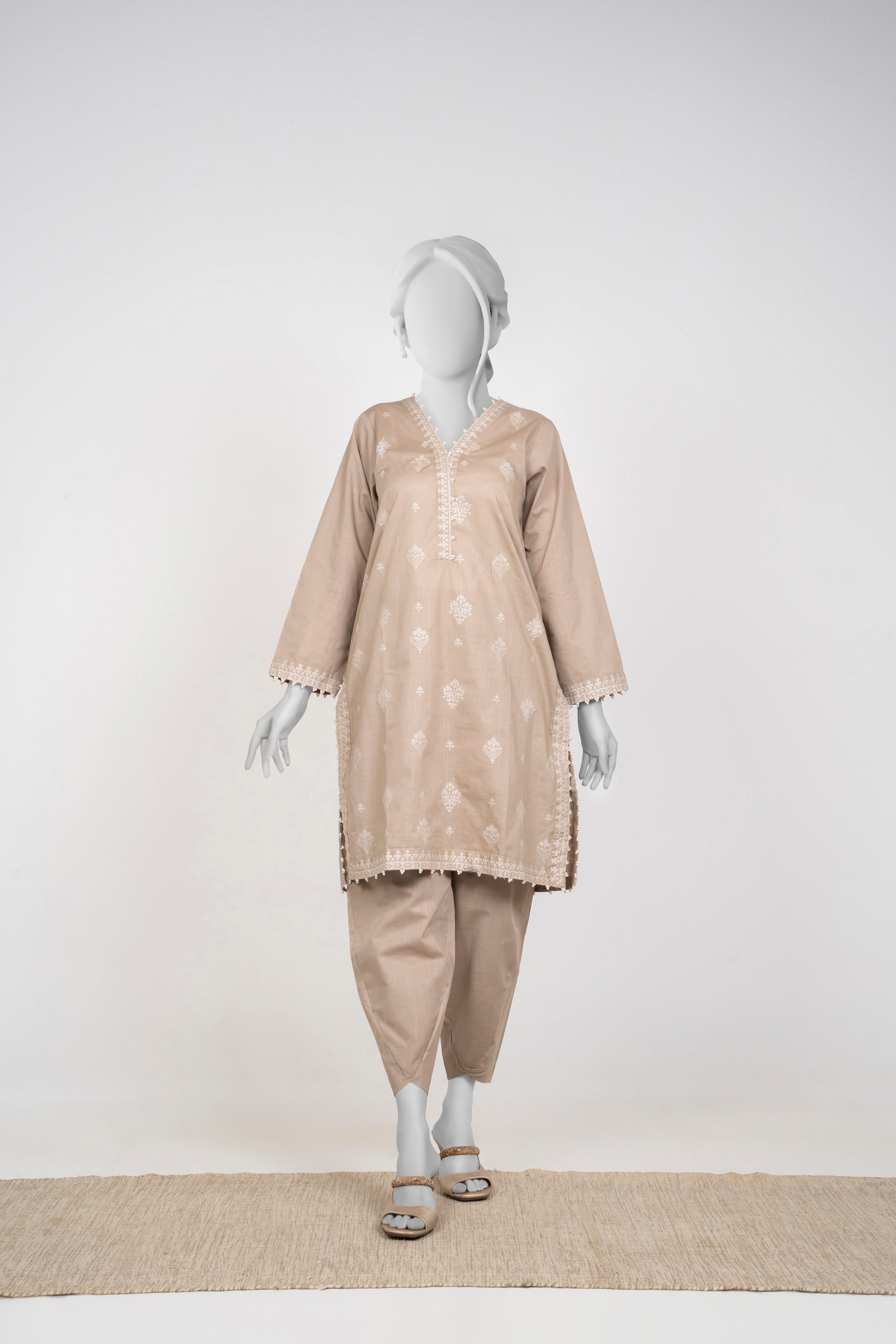 Embrace the Chambray Winters 2025 collection with this elegant Mushroom Beige 2-piece set featuring solid embroidery that adds refined texture and charm. Paired with tulip-shaped trousers, it offers a fresh and graceful silhouette perfect for stylish winter wear. This ensemble blends comfort and sophistication, making it an ideal choice for those seeking understated elegance with a modern touch.
