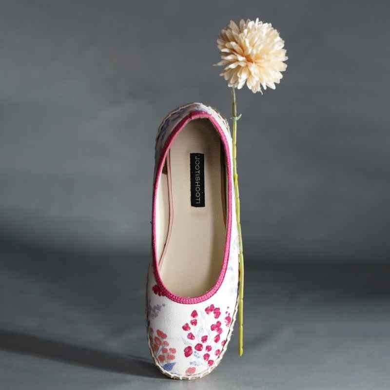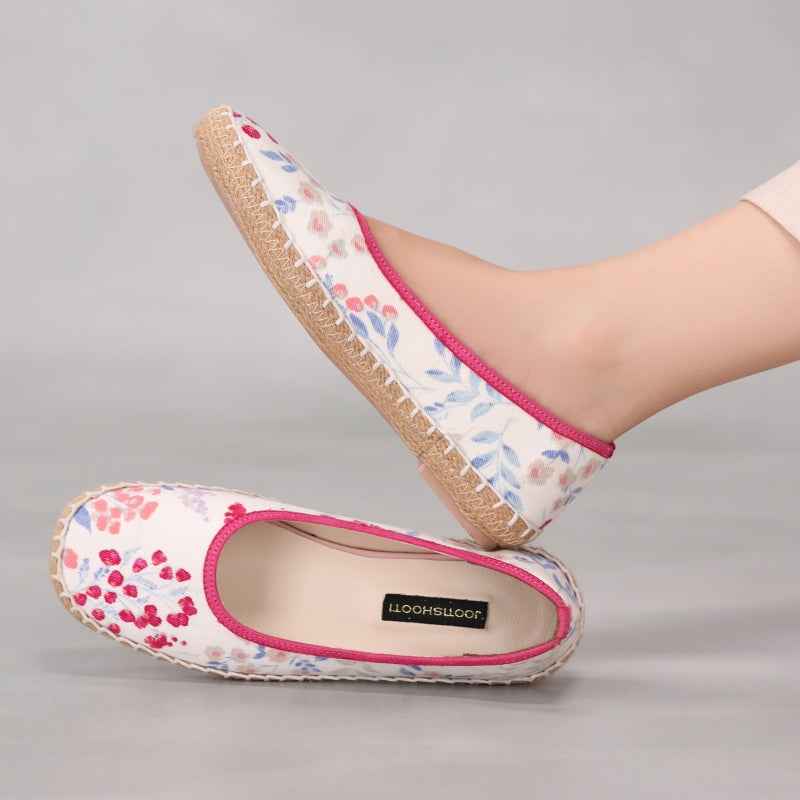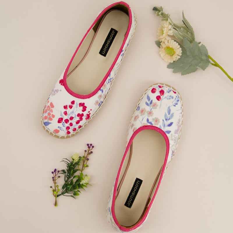 Experience the charm of summertime blooms wherever you go with these soft, floral-printed espadrilles inspired loafers delicately bordered in pink. Their gentle palette effortlessly pairs with soft linens, flowy dresses, and everyday denim. Slip them on and step into the comfort and beauty of a garden in full bloom.