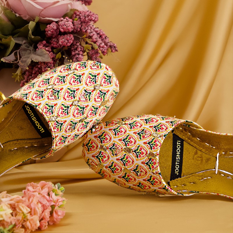 Brighten your step with our "Sundus" Nawabi Khussas. This handcrafted pair features a cheerful yellow background adorned with intricate red and green floral patterns, bringing a touch of vibrant elegance to your ensemble. The warm golden interior enhances the overall look and provides exceptional comfort.