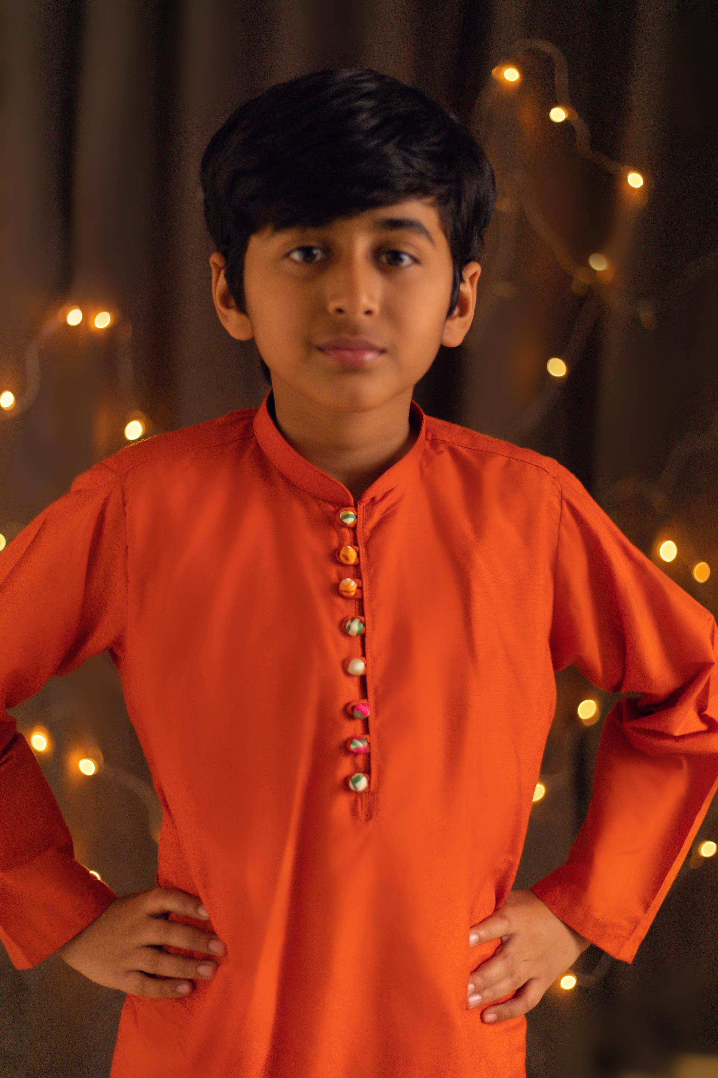This vibrant orange cotton silk kurta features stylish button detailing, paired with a crisp white wash-and-wear shalwar for a classic and comfortable look. Perfect for your little one, this outfit adds a pop of color while keeping it easy to wear for any occasion.
