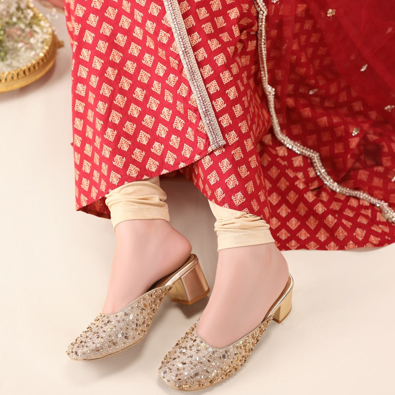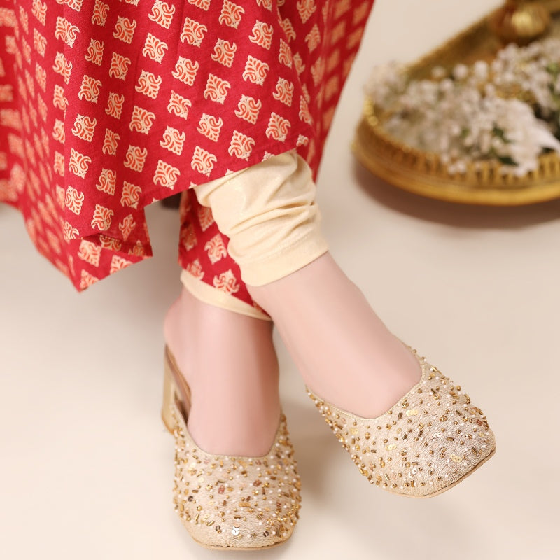 These stunning handcrafted heels feature a soft gold base adorned with an array of dazzling gold sequins, beads, and intricate embroidery. The luxurious embellishments create an elegant yet understated sparkle, perfect for traditional celebrations, weddings, or adding a touch of sophistication to your everyday look. Designed for both style and comfort, these heels are a timeless blend of cultural artistry and modern charm.