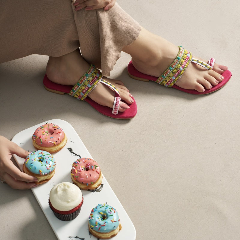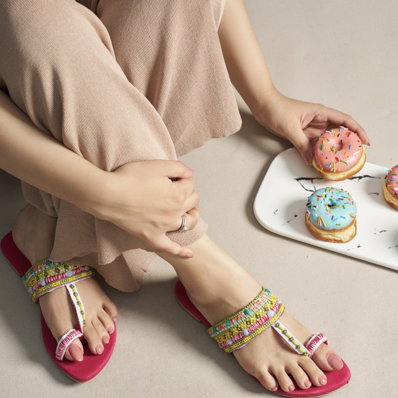 Add a splash of color to your wardrobe with our Vibrant Fiesta Kolhapuris. Designed for those who love playful yet elegant styles, these kolhapuris feature multicolored hand-beaded detailing that instantly uplifts any outfit. The bright pink cushioned sole offers comfort with every step, making them perfect for long summer days or festive occasions.