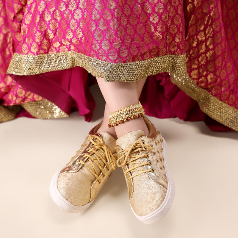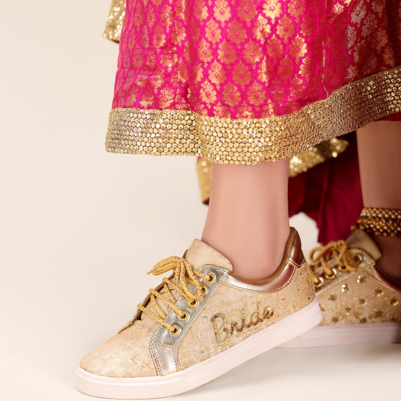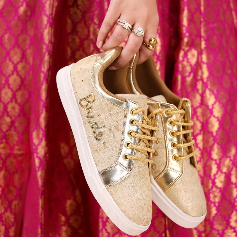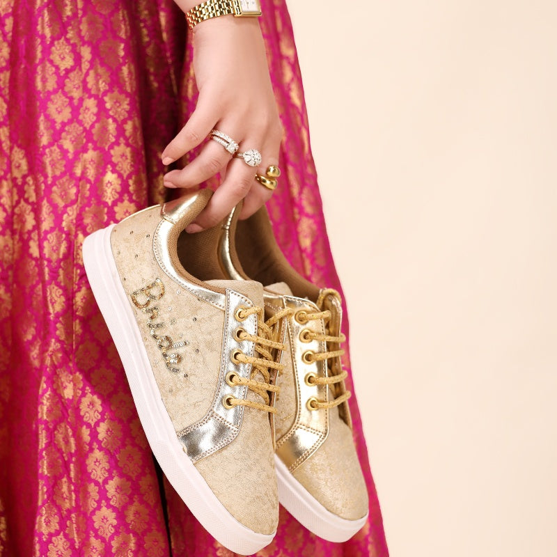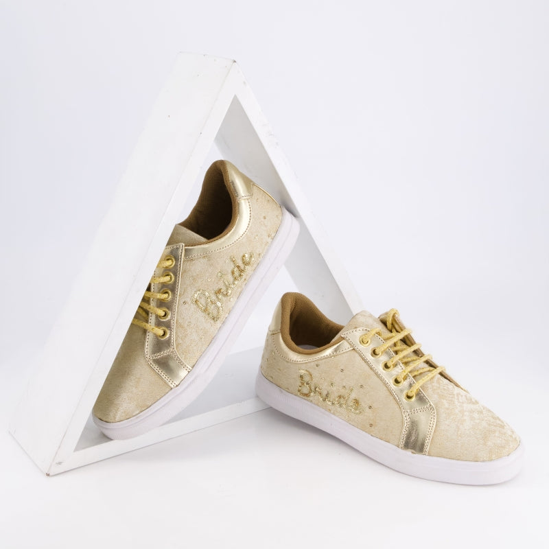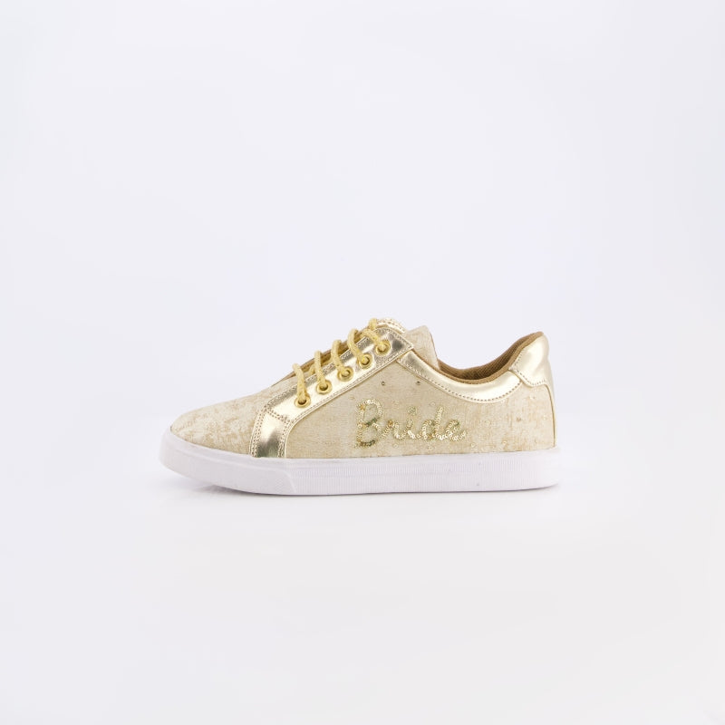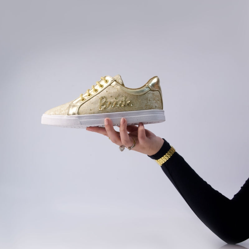Step into your big day with these golden “Bride” sneakers, crafted in muted gold fabric with shimmering metallic overlays, fine glitter accents and sequined “Bride” script—finished on our all-day cushioned sole so you can dance from “I do” through the last song.