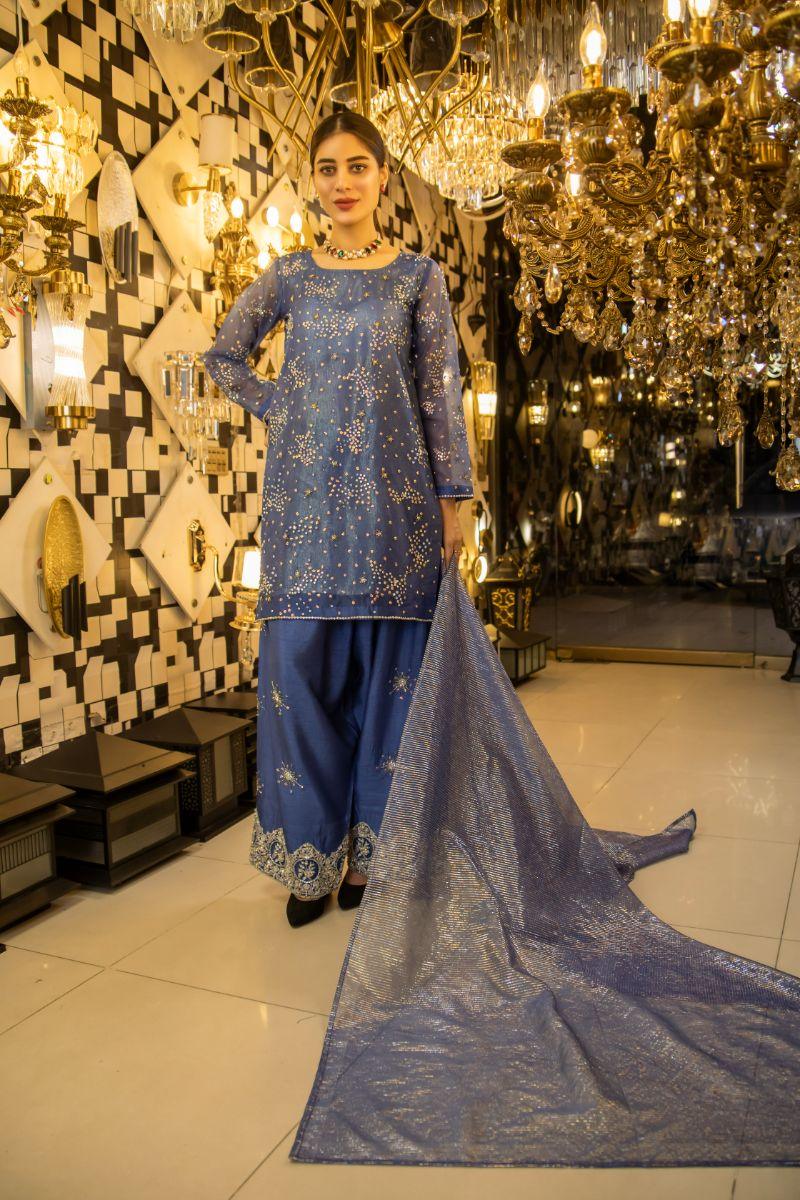 Fairydust is our full hand embalished with intricate sequins and stone ornament outfit.The outfit includes beautiful shirt adorned with pearls and sequins paired with hand embroidered shalwar and dupatta.