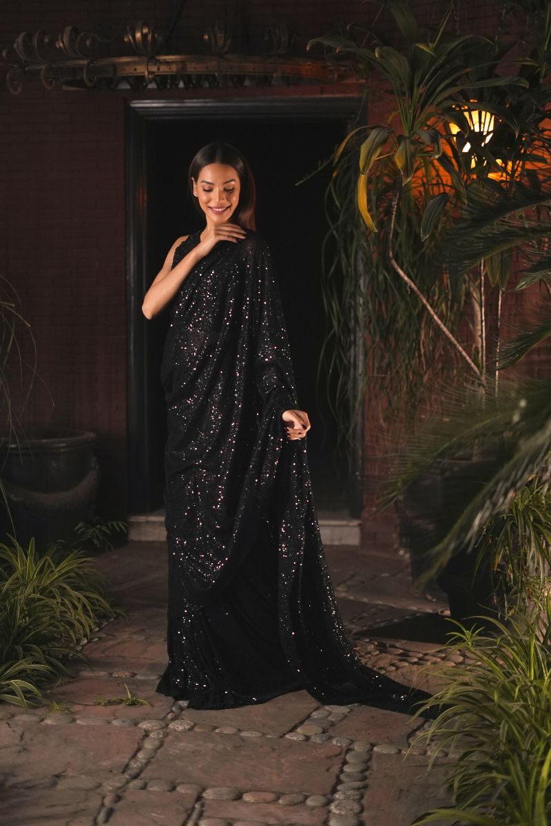 ntroducing an exquisite, sequins saree to enchant the senses Black sequins saree with a heavenly loaded embalished blouse crystal stone, zardozi in shades of black,black stones and sequins including hanging crystal tassels to give it an Aww factor