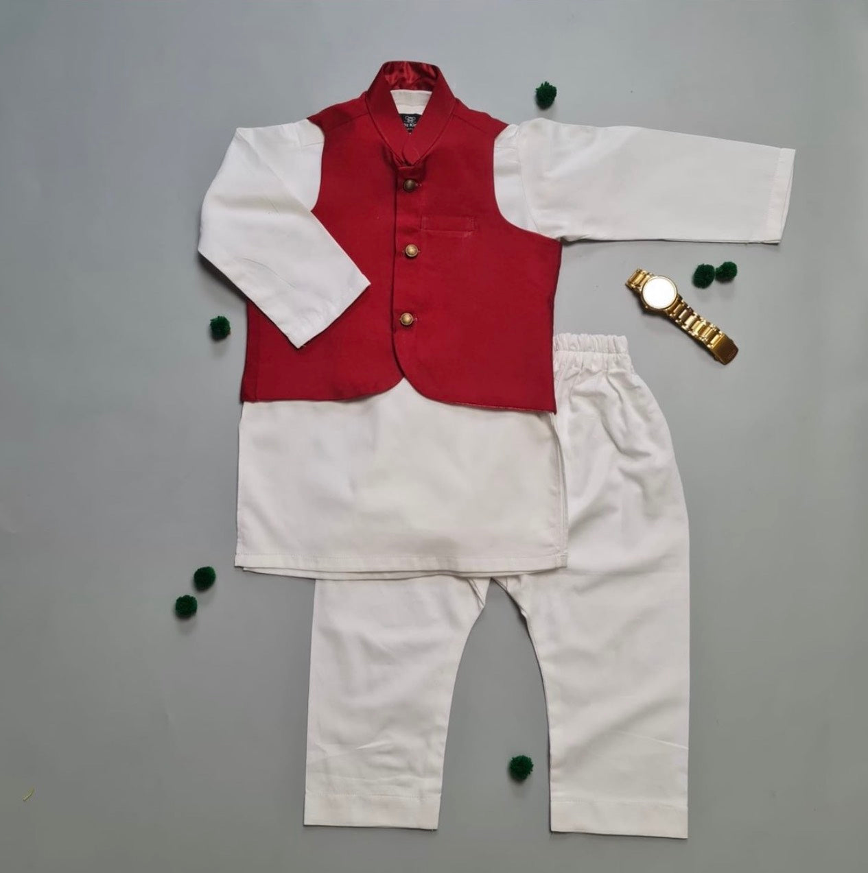 Elevate your wardrobe with this 3-piece ensemble, featuring a sleek White wash-and-wear kurta pajama set. The outfit is paired with a striking maroon cotton silk waistcoat, adding a touch of rich contrast to the classic black base