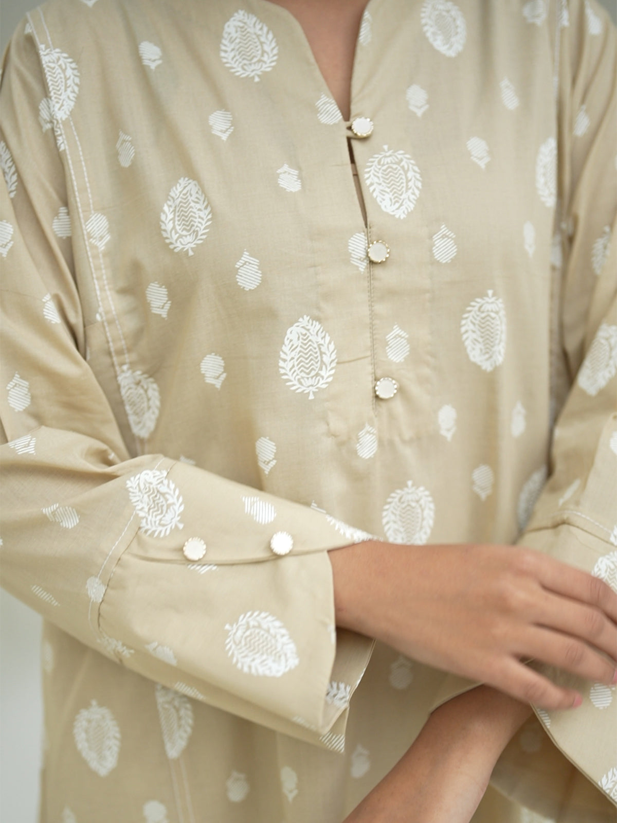 Oaks - Screen Print Cambric Suit For Women - Beige - 2 Piece
