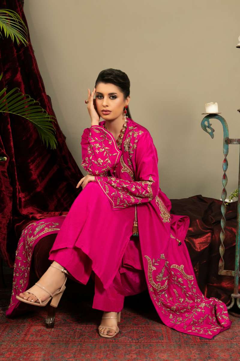 Yasmin Zaman - Hira Korean Silk Suit For Women - Magenta Pink - 3 Piece
