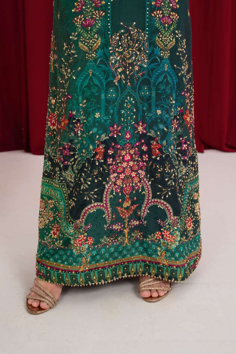 A radiant emerald green kaftan paired with a striking plum?colored short overlay. Crafted from luxurious *pure silk fabric*, the piece bursts with the same digital garden canvas print, accented by delicate hand?stitched Jora?Dabka embroidery that catches the light. A sheer pure organza under?layer adds an airy, glamorous feel, while subtle tick finishings bring the look full circle. Completing the ensemble is an elegant *organza dupatta* that enhances the ethereal vibe.