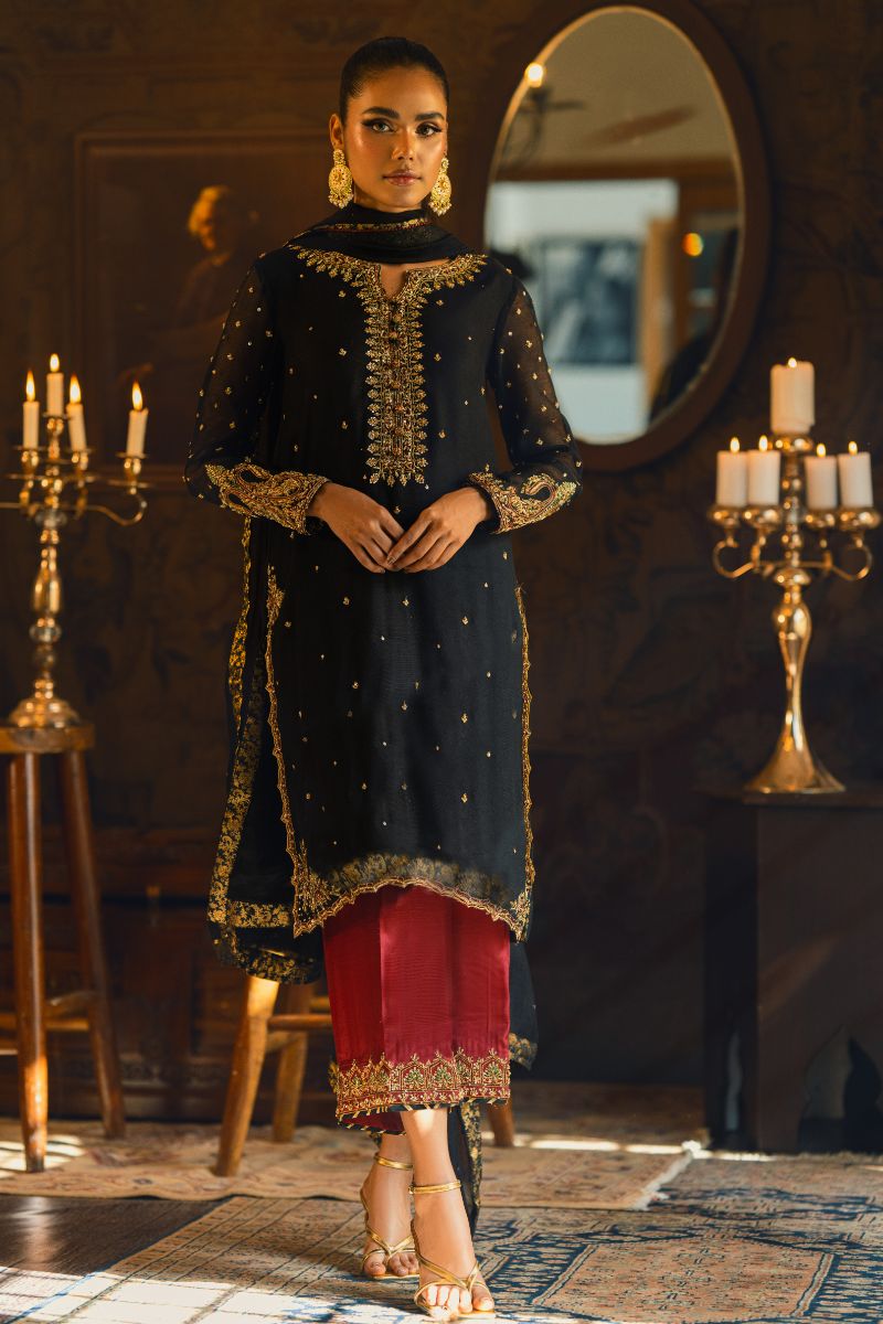 "Alya" is a black embellished kurta with a blend of kora, dabka, zari, pearls, sequins, zardoze and contrasting maroon and green resham. The neckline has embroidered buttons to complete the neckline. It is paired with PK Raw Silk pants with embroidery and block gota lace on the bottom. To complete the look it has khaddi net dupatta with dispersed sequins all over the dupatta and banarsi edging.