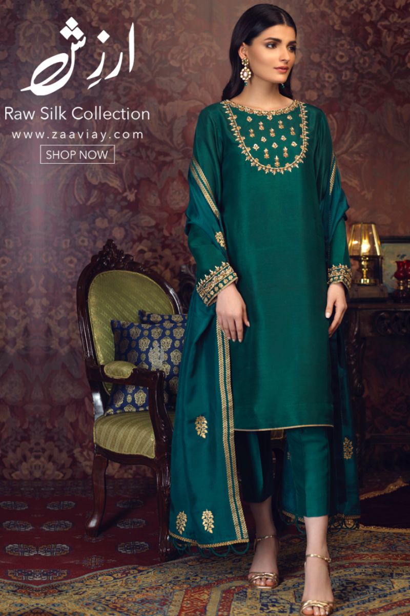 Amaani' is enriched with high quality pk raw silk. It is a straight mid-length emerald green shirt with round neckline and full sleeves. Neckline and sleeves are intricately adorned with kora, dabka, zaari ,aari and regal stones. It is paired with our signature gold screen printed pure silk dupatta with loops finishing.