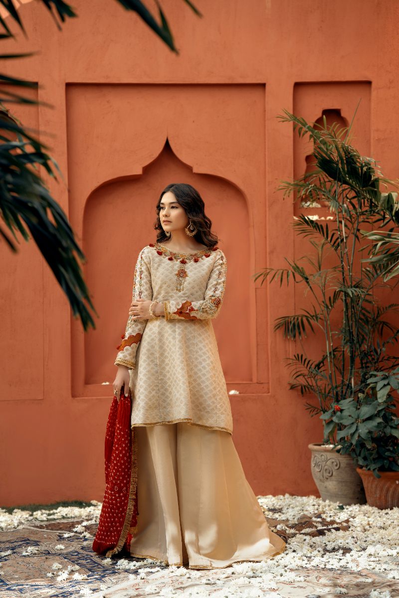 Ivory cotton net self print peplum embedded with 3D artwork and intricately embellished with dabka, resham, sequins, pearls and mirror work. Sleeves are detailed with organza appliqué and Gota trimmings. It is paired with a matching paneled dhaka pants and crimson chunari dupatta with Gota trimmings.
