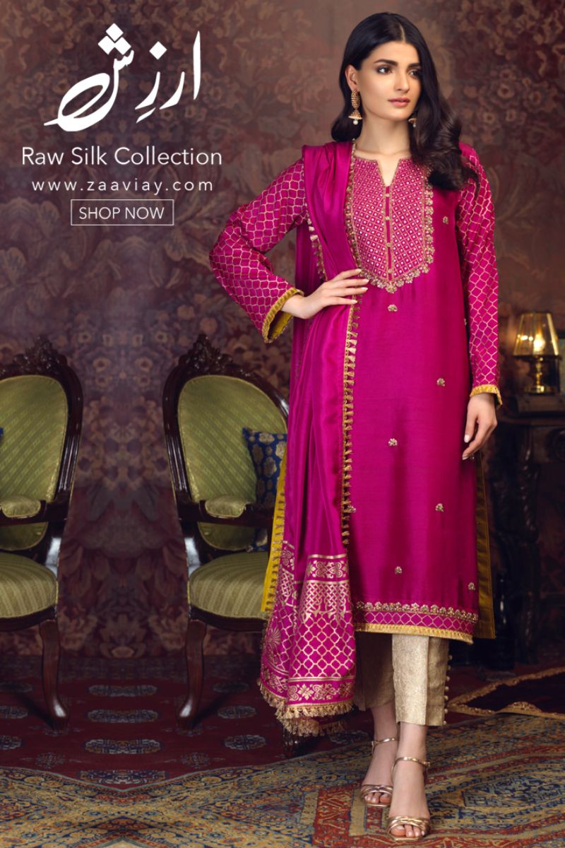 Deeba' a definite ready to wear for the festive wardrobe. A straight line magenta shirt, alluring in pk raw silk fabric with geometrical hand crafted neckline, incorporated with kora, dabka, aari, zaari. Sleeves are screen printed with accent lime green finishing on sleeves and shirt hem. It is paired with a pure silk dupatta with screen printed borders and edging lace to give it a elegant look.