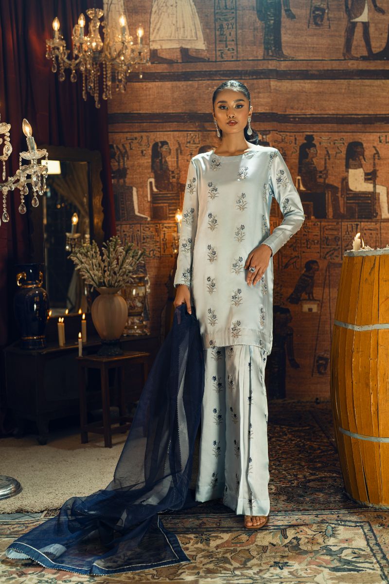 "Hieroglyph" is a sky blue straight short shirt beautified with 2 colored screen print. Front of the shirt and sleeves embellished with intricate tilla, dabka, sequins and zardozi work. It is paired with matching flared pants and contrasting Navy blue dupatta.