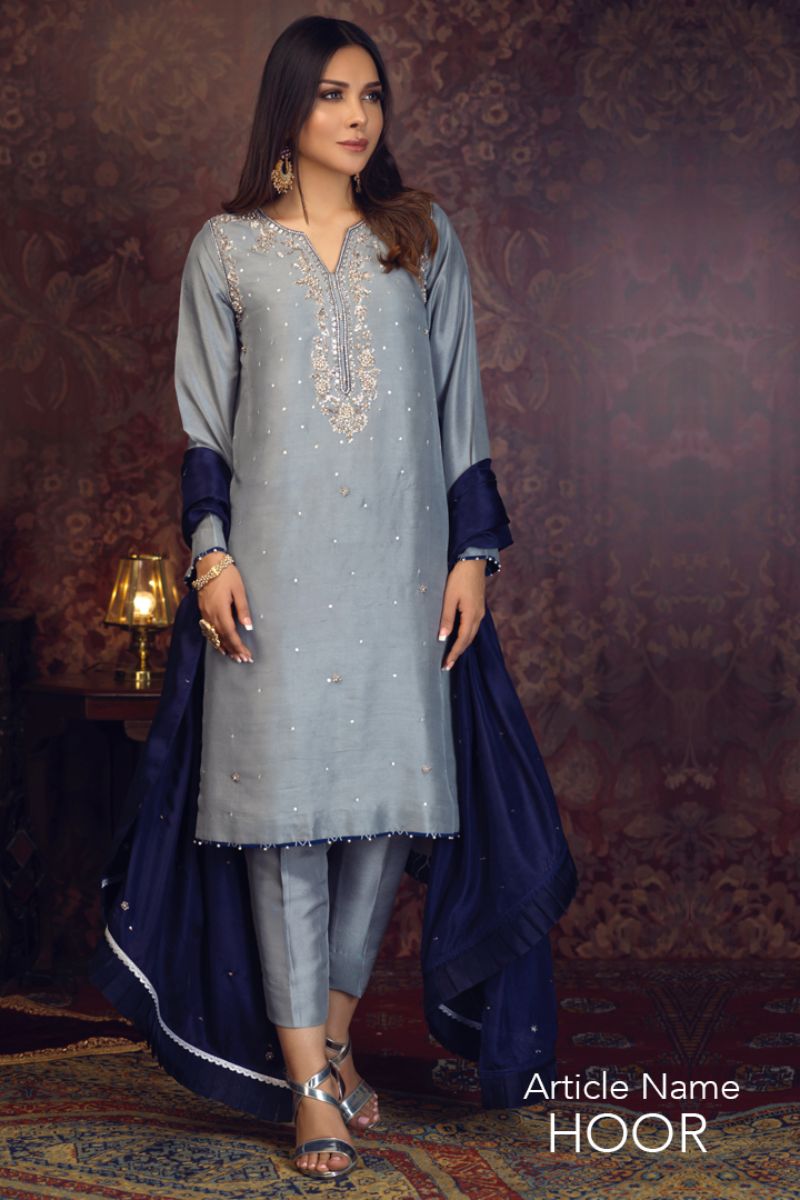 Hoor' an impressive outfit with the tinches of silver embellishment on neckline and adorned with silver sequins on shirt to give a sparkling look. Contrasting color of blue and silver screen print is given for the finishing on neckline, sleeves and damaan. It is paired with a navy blue pure silk dupatta adorned with silver sequins adding color to the subtle attire.
