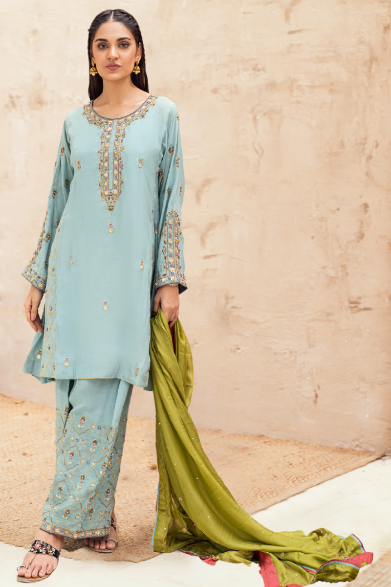 Insiya' is an A-line traditional kurta with a detailed neckline enhanced with gota, zari, dabka, kora, pearls and zardozi work. It is paired with matching pk rawsilk shalwar hand embroidered from hem and tissue silk green dupatta finished with peach and blue trimmings enhanced with tassels on the corners.