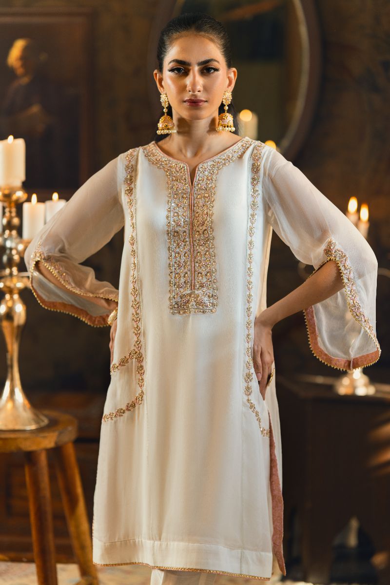 "Mahrin" is an ensemble that comprises of an ivory A-line kurta with blend of kora, dabka, zari, pearls, sequins, zardoze and contrasting baby pink resham. The sleeves have a unique cut, which is also embellished. This look is completed with a baby pink net dupatta with lace all over the borders. Complimenting this with straight white pants with an edging of pink banarsi and lace.