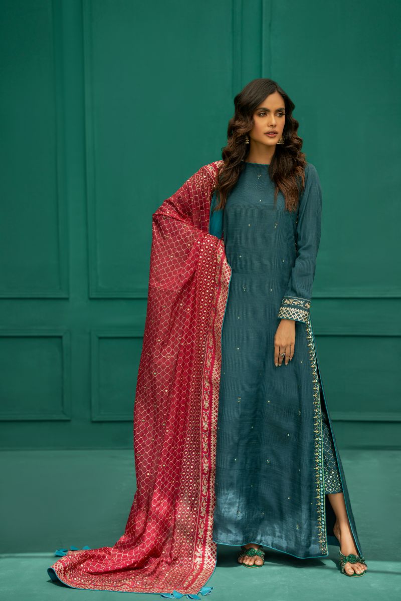 Modern yet elegant, Meraki is a long straight shirt in teal color. The side seam and sleeves are detailed with screen print and hand embroidery. This outfit is paired with matching screen printed and handworked straight pants along with a contrasting deep pink dupatta including print and handwork.