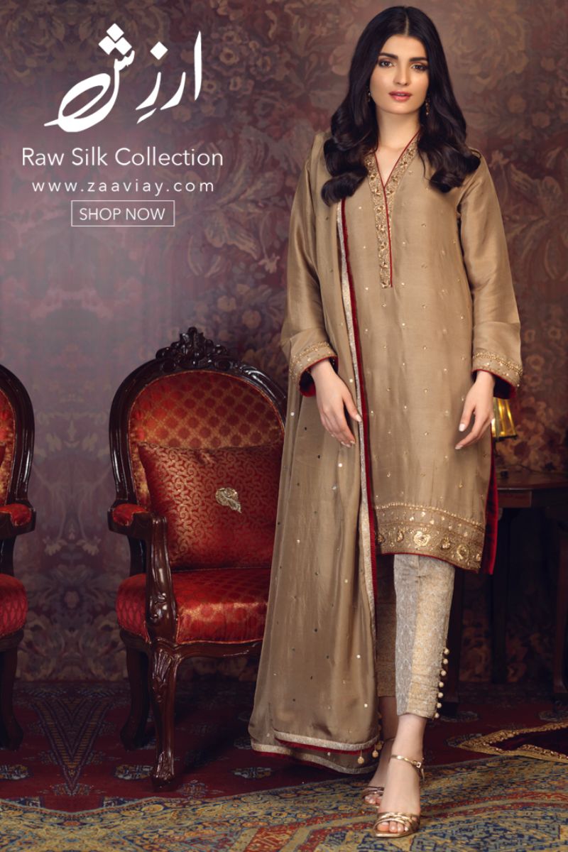 Pareesa' A classy outfit in beige color with accents of deep reds to flawlessly balance the theme of the outfit. Improvising detailed work on the overlap neckline and on sleeves border and a spray of sequins all over the shirt and pure silk dupatta detailed with the lace on four sides of the dupatta. This ensemble is perfect for pre-wedding events.