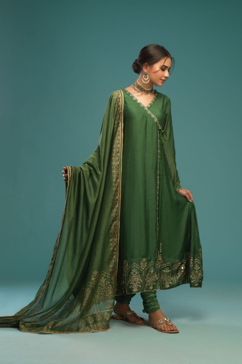 Reema is an elegant raw silk angharka in the hues of green with beautiful mehrab and floral motifs on the borders embellished with sheesha, kora, dabka giving a luxurious look. This angharka is paired with a cotton silk churidar and khaddi net screen printed dupatta finished with lace.