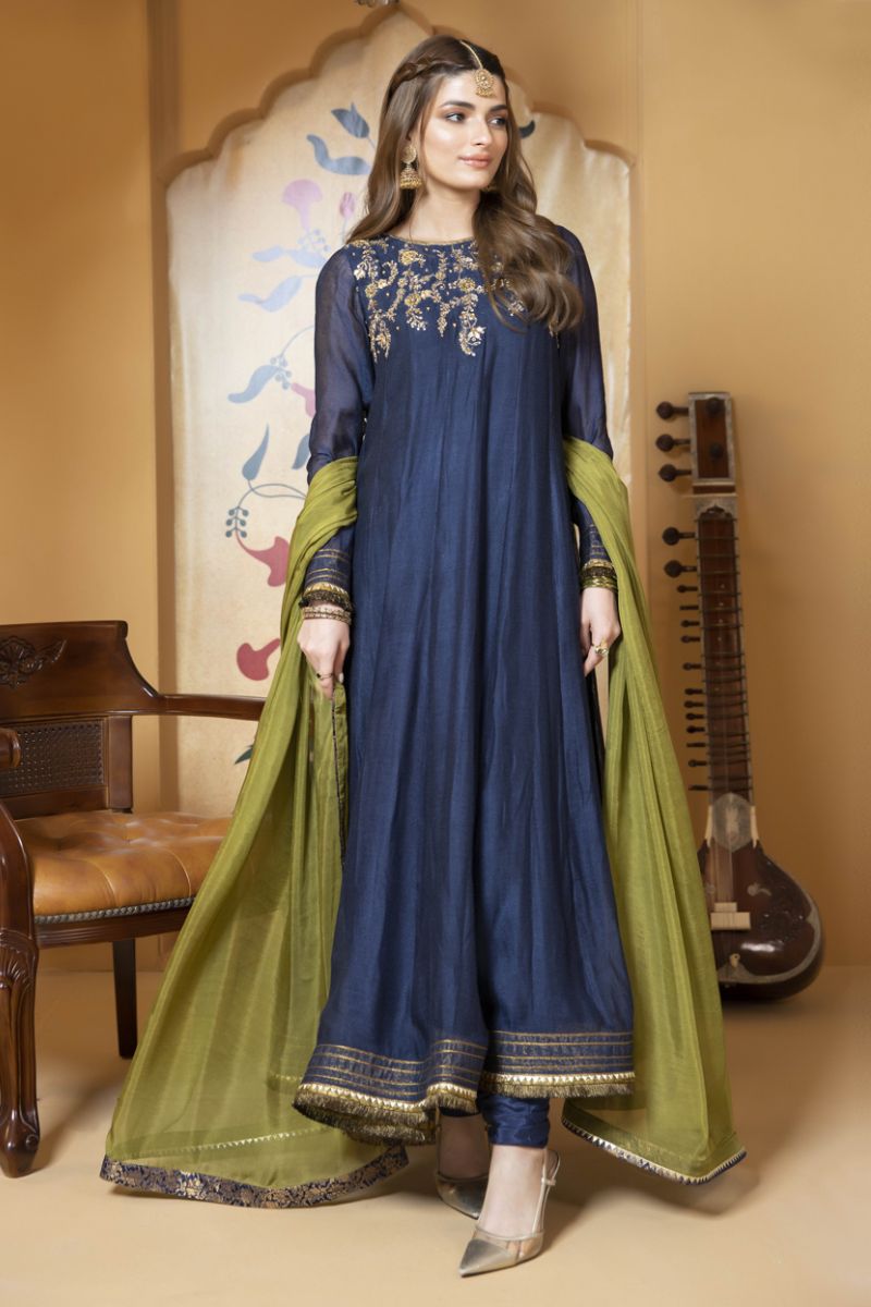 Roop' is a flarey kalidar in navy blue khadi net with intricate gota, kora and dabka work and a complementary sage green resham. The stunning outfit is embellished with gold and copper laces with complementing sage green banarsi. The flared paneled frock is paired with navy blue raw silk churidar and a sage green tissue silk dupatta with lace finishings all over the borders..