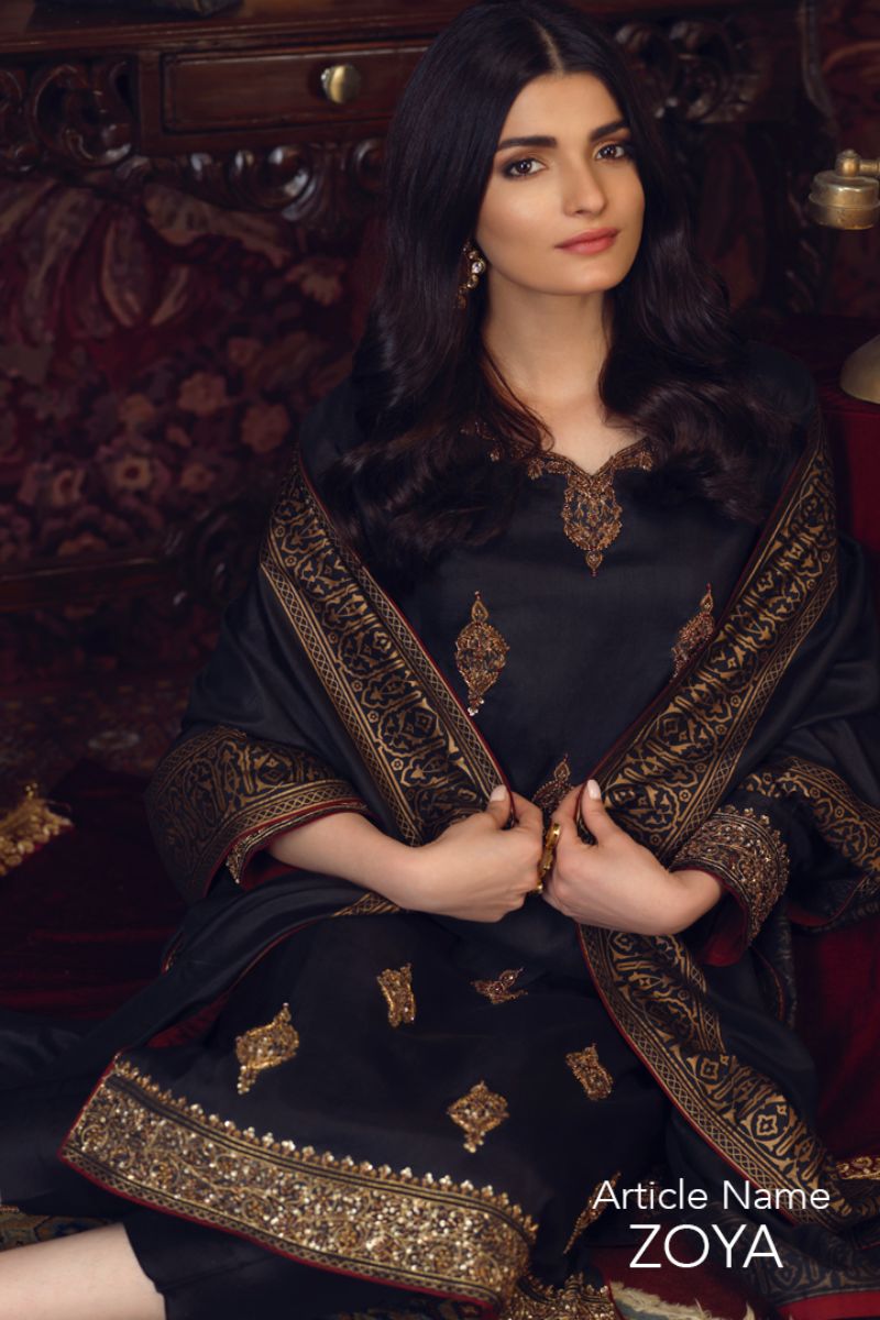Zoya' a stunning black attire, perfect for formal event. Hand crafted with detailed work of kora, dabka, zaari and aari composed on the front, neckline, sleeves border, damaan with maroon finishing to give it a perfect look. It is paired up with pure silk dupatta with screen printed borders on four sides enriched with maroon tussels. It makes a perfect fancy outfit for pre wedding events.