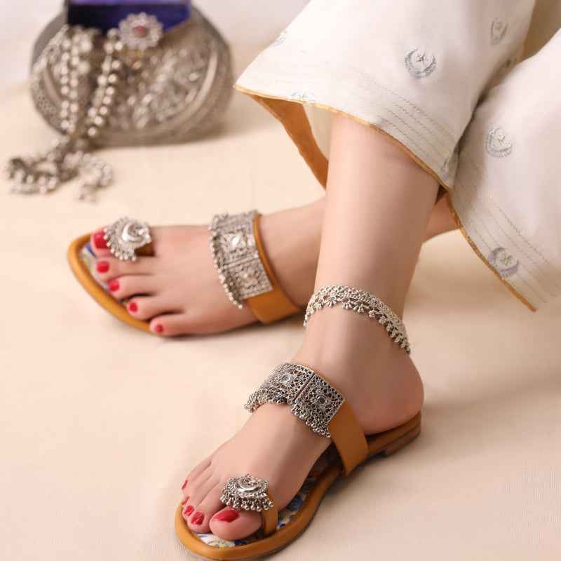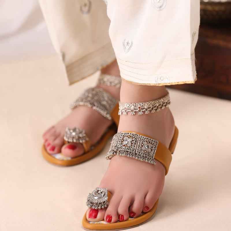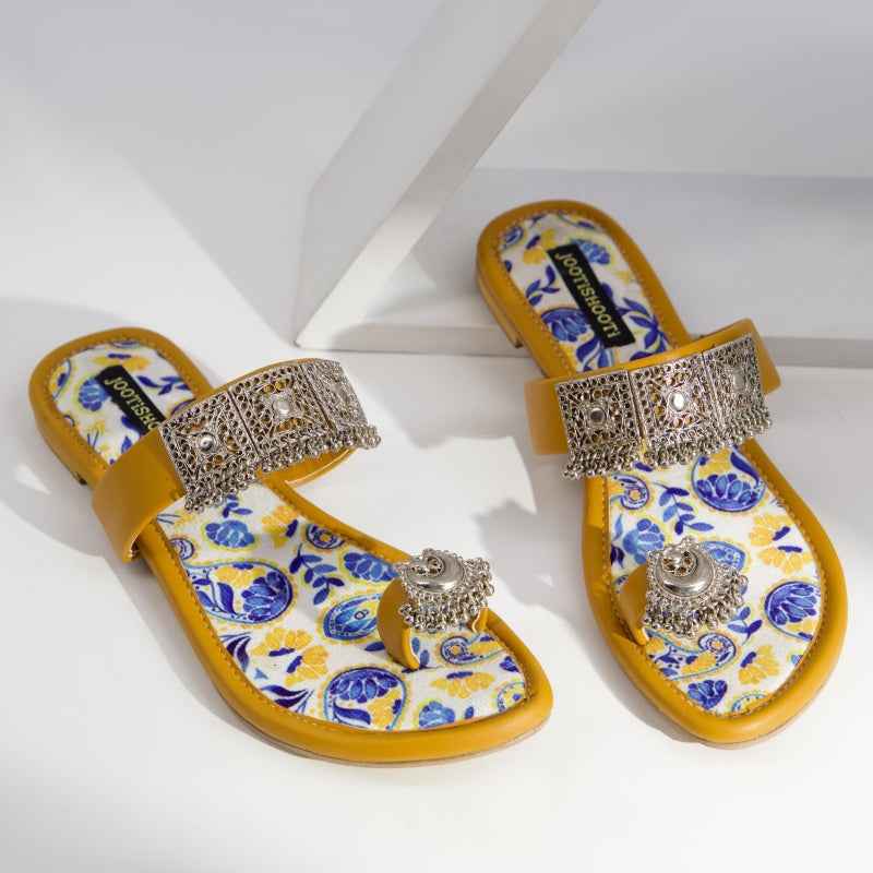 This mustard-yellow faux-leather sandal features ornate silver-tone filigree panels and a matching toe ring, resting on a printed-velvet insole patterned with cobalt-blue and saffron paisley and floral motifs—an homage to classic block-print aesthetics. Each pair is entirely handcrafted, so slight variations in print intensity and metal detailing ensure your sandals are one-of-a-kind. Pair them with crisp white palazzo pants and silver anklets for breezy daytime flair, or let the warm mustard hue light up a navy silk kurta for festive evenings. Care for them by wiping the leather straps with a damp cloth, dusting the filigree with a soft, dry cloth, and stashing them in a cool, dry spot away from direct light.